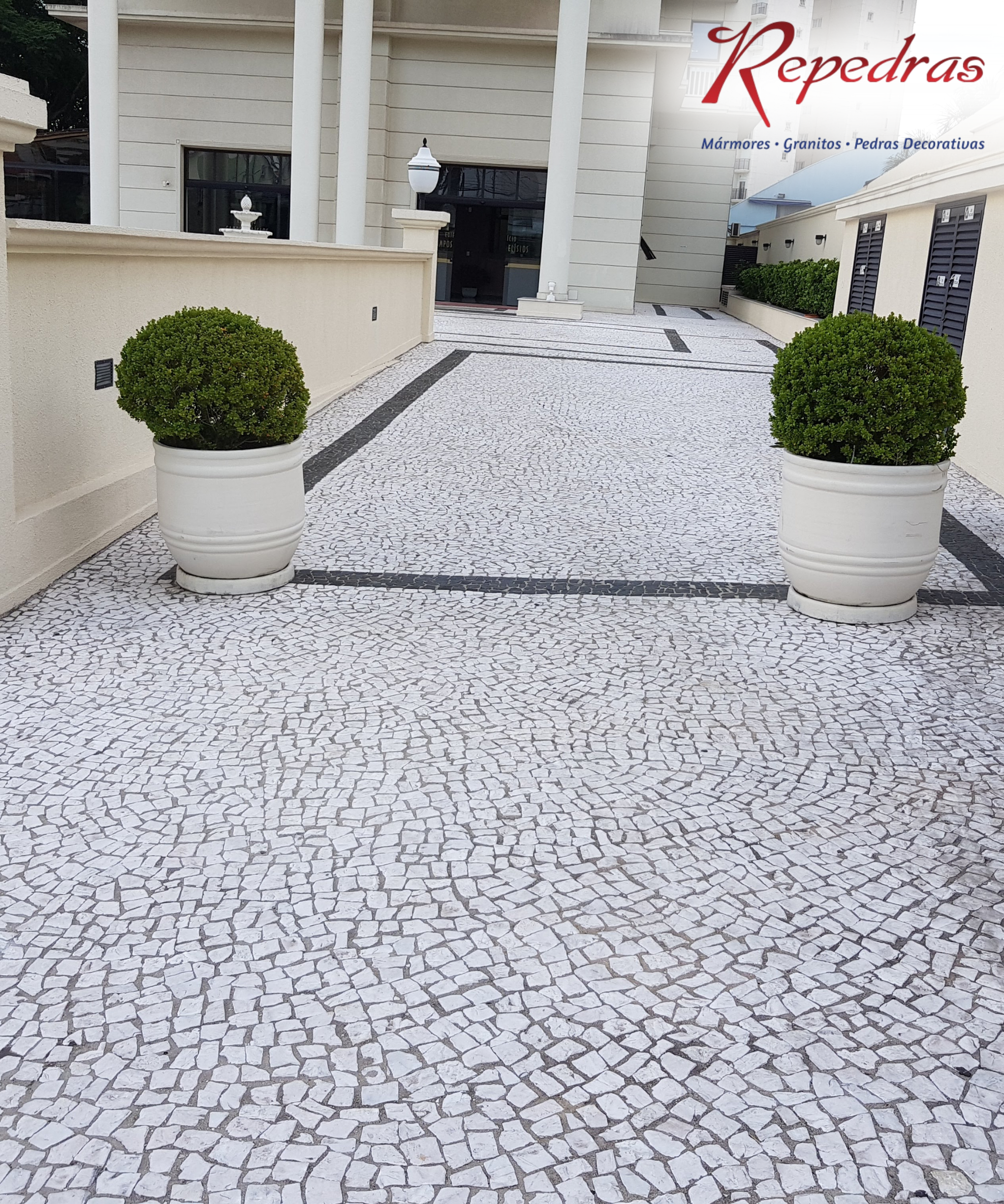 O Mosaico Português Branco, também conhecido como Calçada de Copacabana, é amplamente utilizado no Brasil em calçadas, praças, jardins, áreas externas residenciais e comerciais, fachadas e detalhes decorativos.